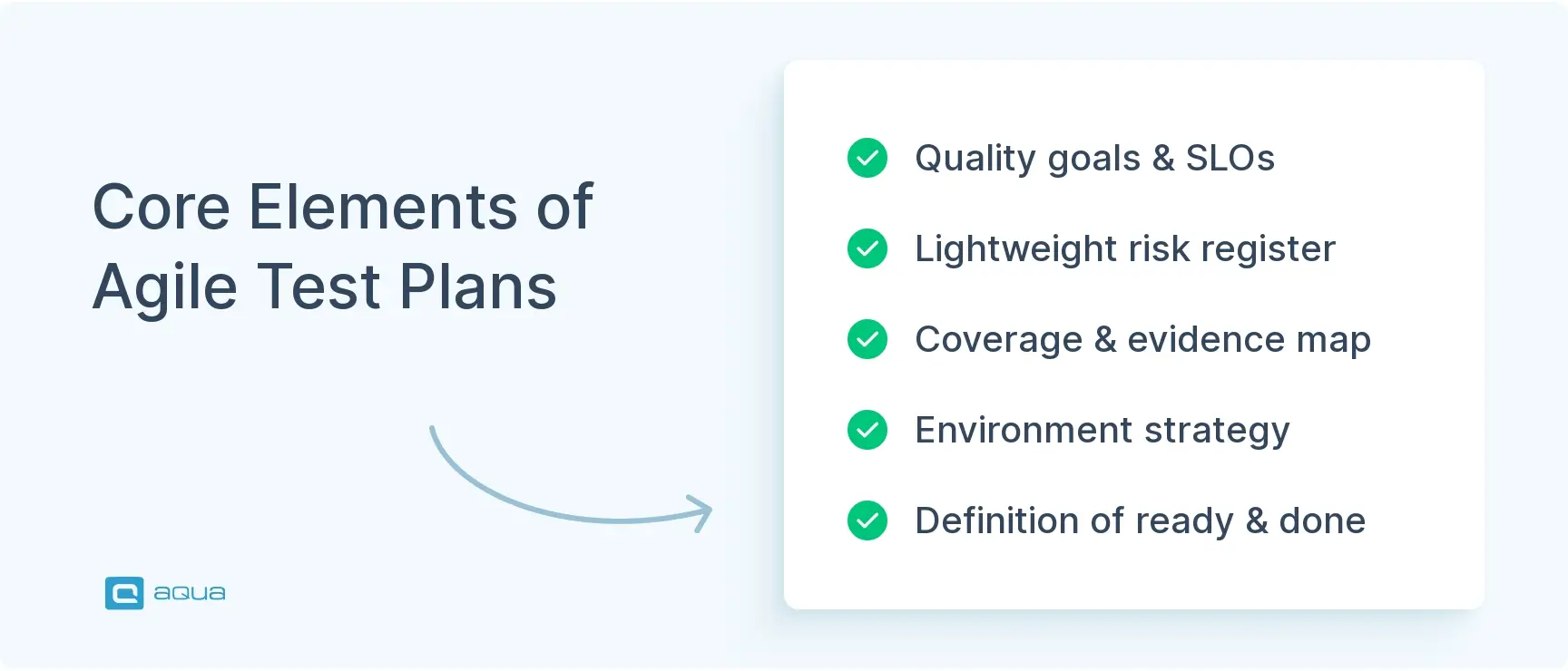 Essential elements include quality goals and SLOs that define success criteria upfront. Add a lightweight risk register that ranks threats by likelihood and impact. Include a coverage map that links risks to test evidence across pipeline stages. Document your environment strategies and test data strategies to ensure realistic validation. Finally, establish clear Definitions of Ready and Done with explicit quality criteria. These components create visibility into what can break and what evidence mitigates risks without bureaucratic overhead.