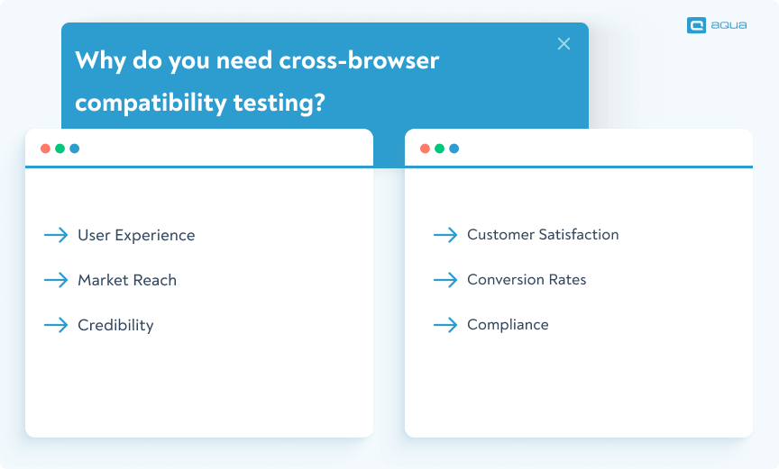 - Compliance: Cross-browser compatibility testing ensures compliance with accessibility standards and legal requirements related to web accessibility. Many jurisdictions have regulations to ensure that websites are accessible to users with disabilities, and cross-browser compatibility testing helps identify and address accessibility barriers across different browsers.Ā