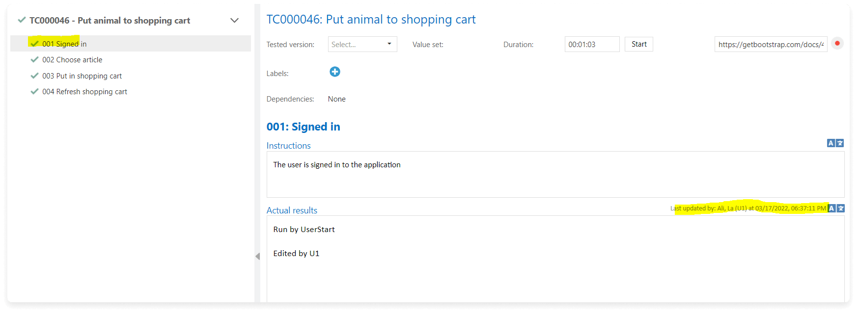 - Aktualisieren Sie alle Informationen für den Testfall, wie beispielsweise die Testfallschritte.