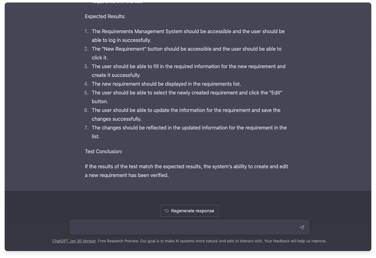 Wenn die Ergebnisse des Tests mit den erwarteten Ergebnissen übereinstimmen, wurde die Fähigkeit des Systems, eine neue Anforderung zu erstellen und zu bearbeiten, überprüft.