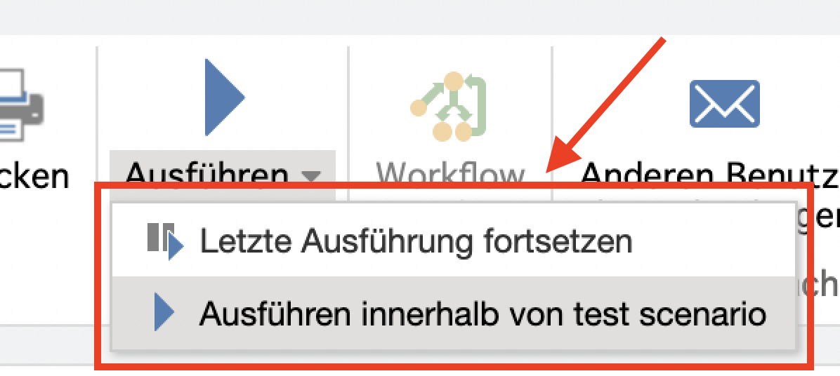 Die Option, mit der Testausführung fortzufahren, ist auch für das Testszenario verfügbar. Wenn ein Testfall Teil eines Testszenarios ist, kann ein Tester die Testausführung fortsetzen, indem er die entsprechende Schaltfläche anklickt und das gewünschte Testszenario auswählt.