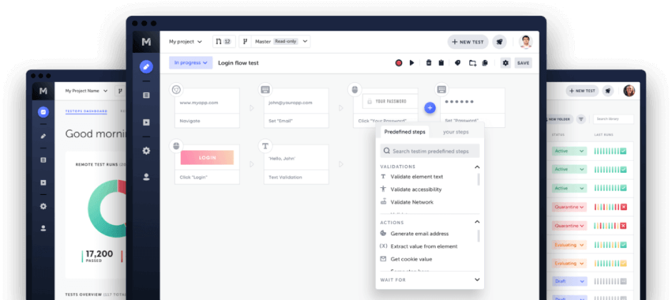 Der Funktionsumfang von Testim weist viele Ähnlichkeiten mit Perfecto Scriptless auf. Beide werben mit selbstheilenden Tests, guter Transparenz für eine schnelle Fehlersuche und der Möglichkeit, den Umfang zu erweitern. Der Ansatz von Testim zielt jedoch eher darauf ab, erfahrene Ingenieure beim Schreiben automatisierter Tests zu unterstützen, anstatt sie ganz ohne Code zu erstellen. Die wichtigsten Bereiche sind UI-, API- und Funktionstests.