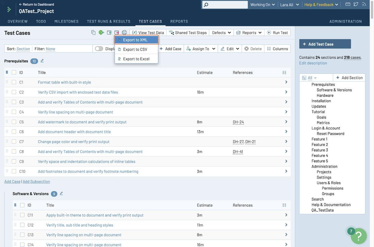 Open your TestRail instance and navigate to the project you want to migrate. XML is the only format aqua currently supports for TestRail migrations. It preserves the nested section hierarchy that CSV and Excel exports flatten, giving you significantly more accurate results on the aqua side.