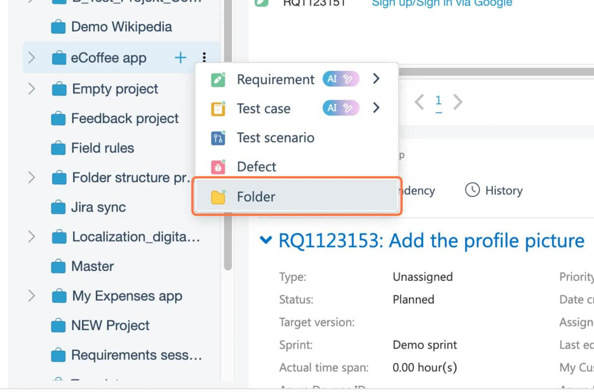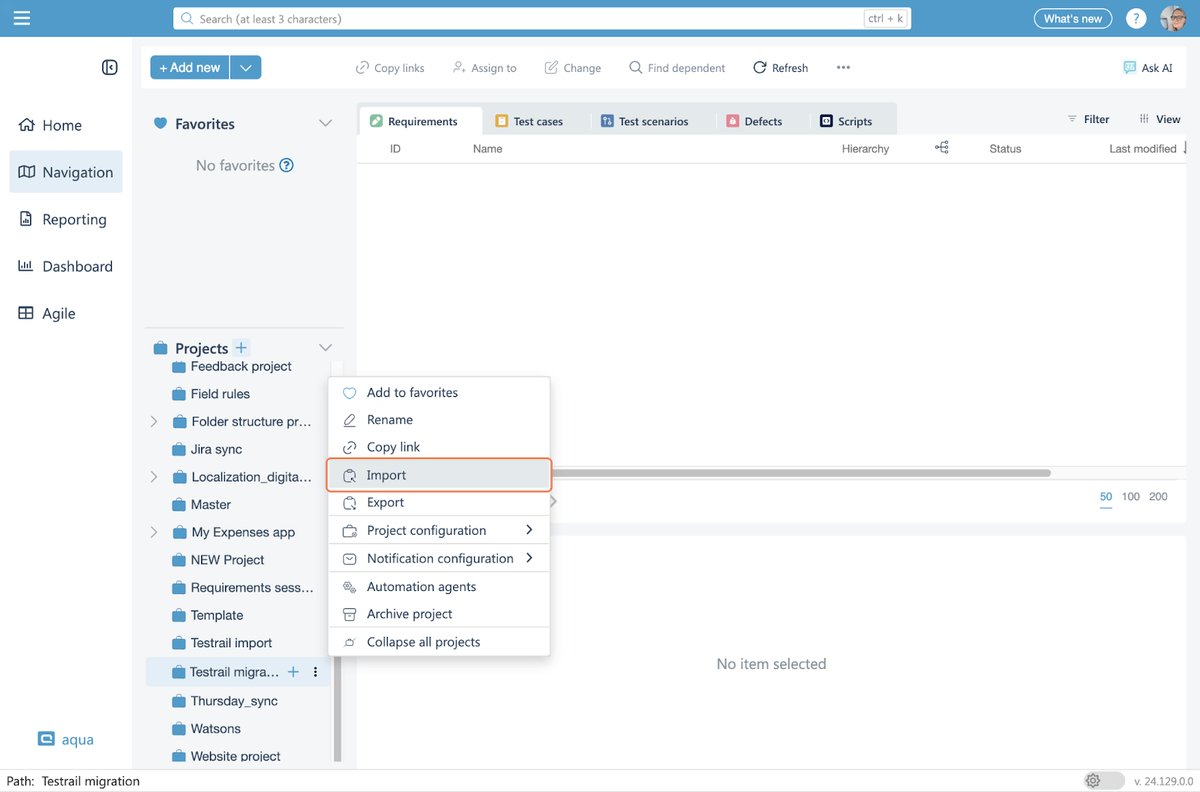 aqua maps TestRail’s section hierarchy directly to its folder structure, so your organizational logic carries over. If you want TestRail sections to land in a specific folder rather than the project root, select or create that folder before triggering the import.