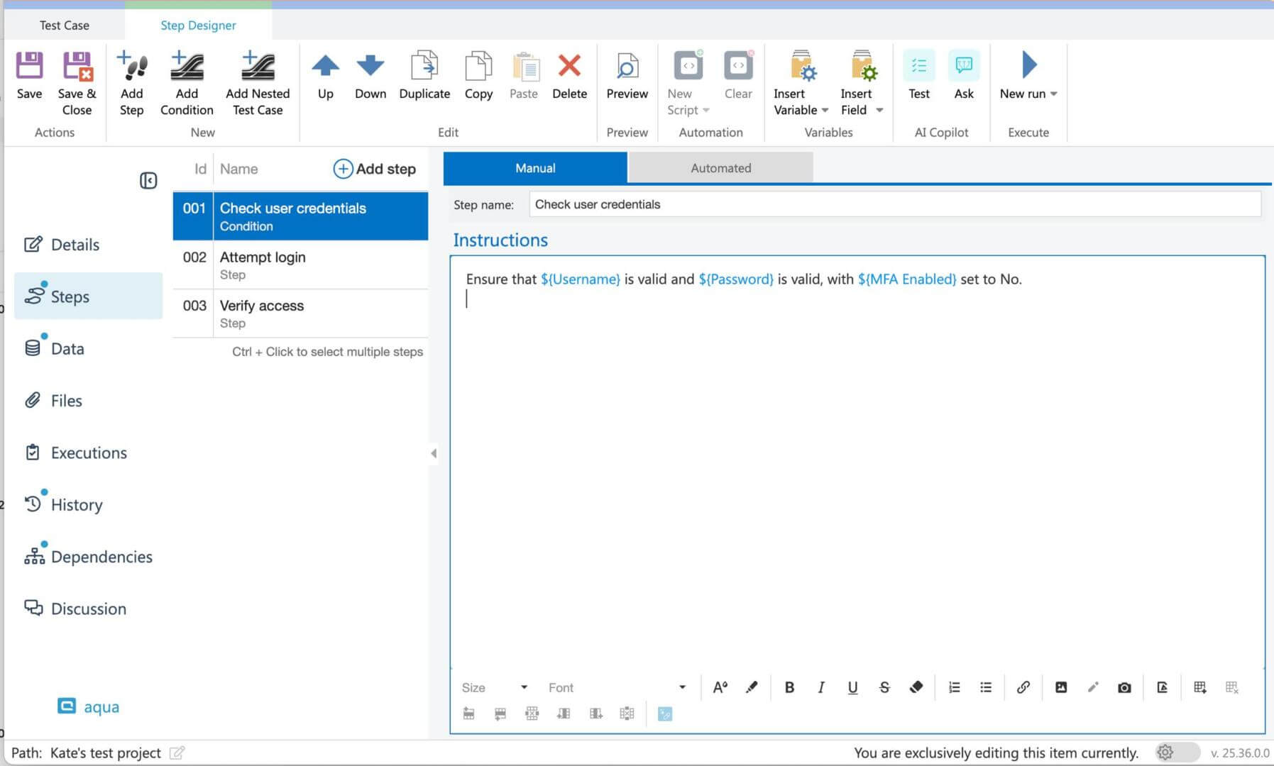 Auto-advance: a new project setting lets you enable automatic advance to the next step when marking a step as Failed or Blocked, eliminating extra clicks during test runs.